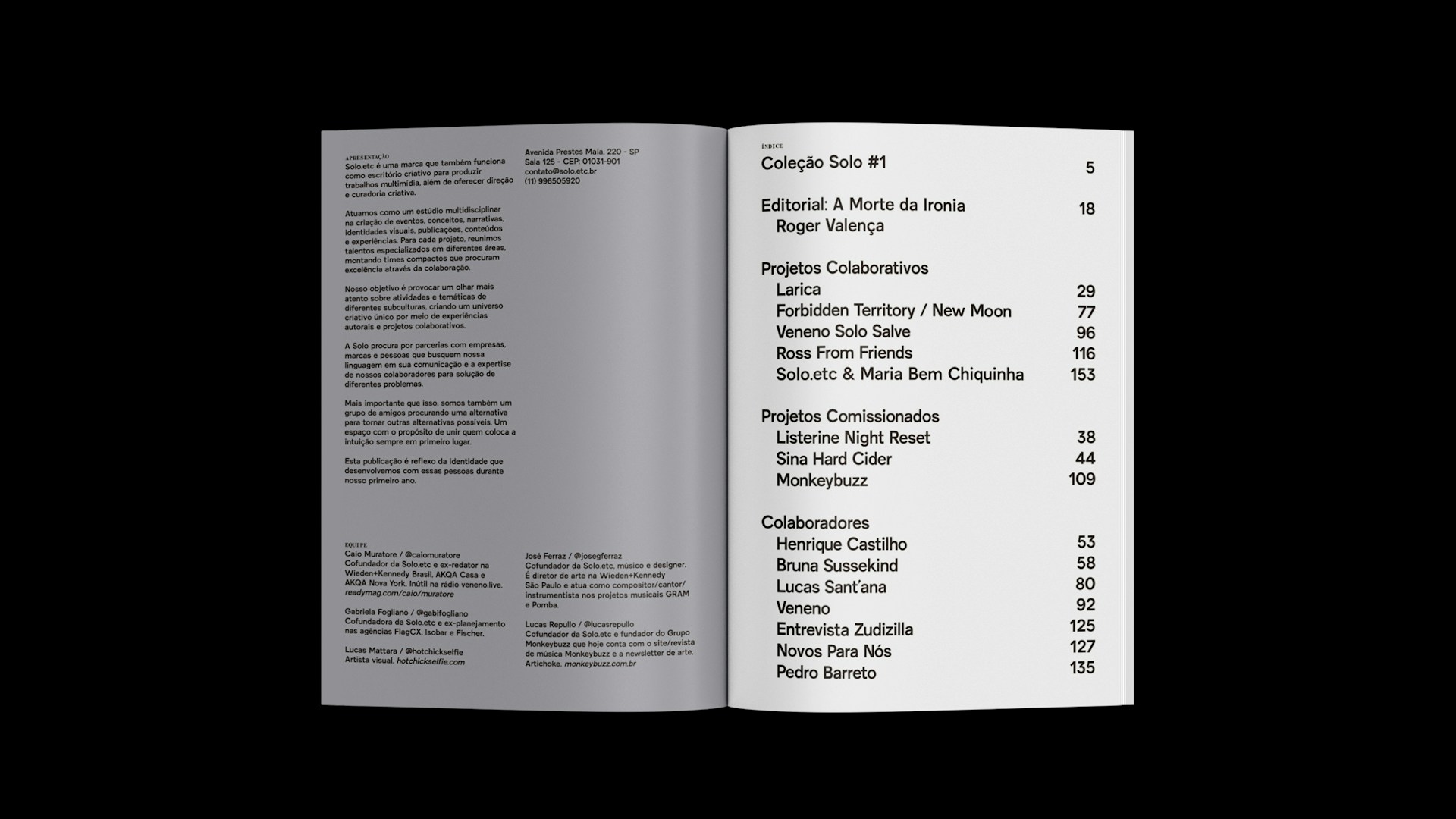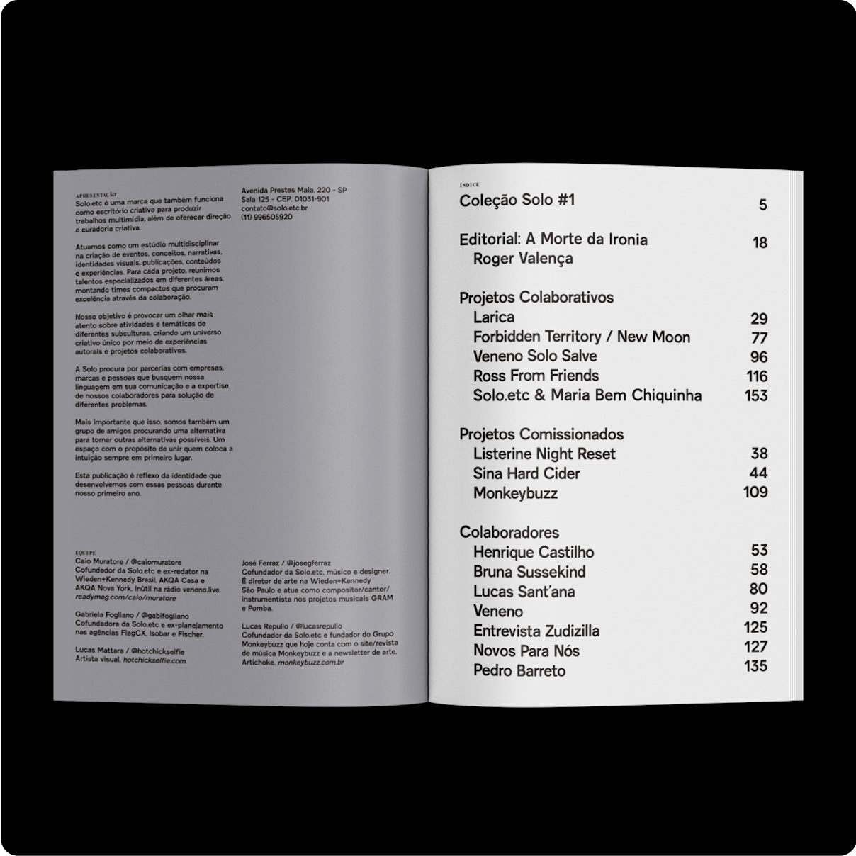 Editorial/Conceito/Publicação: Solo.etc Design Gráfico: Daniel Frota Foto Capa: Naira Mattia Colaboradores: Bruna Sussekind; Lucas Sant'Ana; Henrique Castilho; Pedro Barreto; Roger Valença; Zudizilla